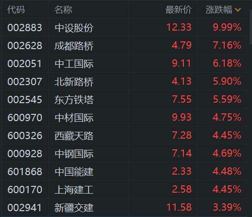 A股基建股集体拉升,其中,中设股份开盘直线封涨停,成都路桥涨超7%,中工国际涨超6%,北新路桥、中材国际、中国能建、上海建工、西藏天路、新疆交建跟涨。中金公司日前研报称,2024年下半年,已看到基建端财政发力的迹象,如专项债发行提速、年末地方政府特殊再融资债加速发行等;展望2025年,预期基建投资有望在财政加码和化债发力的推动下实现小幅增长,预计增速提升至10%左右,但2025年地产投资或仍将承压、制造业投资亦可能出现降速,建筑板块基本面或将继续迎来分化。中金公司推荐稳中求进的选股思路,重点看好基本面相对稳健,同时受益于化债和市值管理新规的建筑央企;以及受益于海外基建市场充沛订单、估值处于相对底部的国际工程企业。(格隆汇)